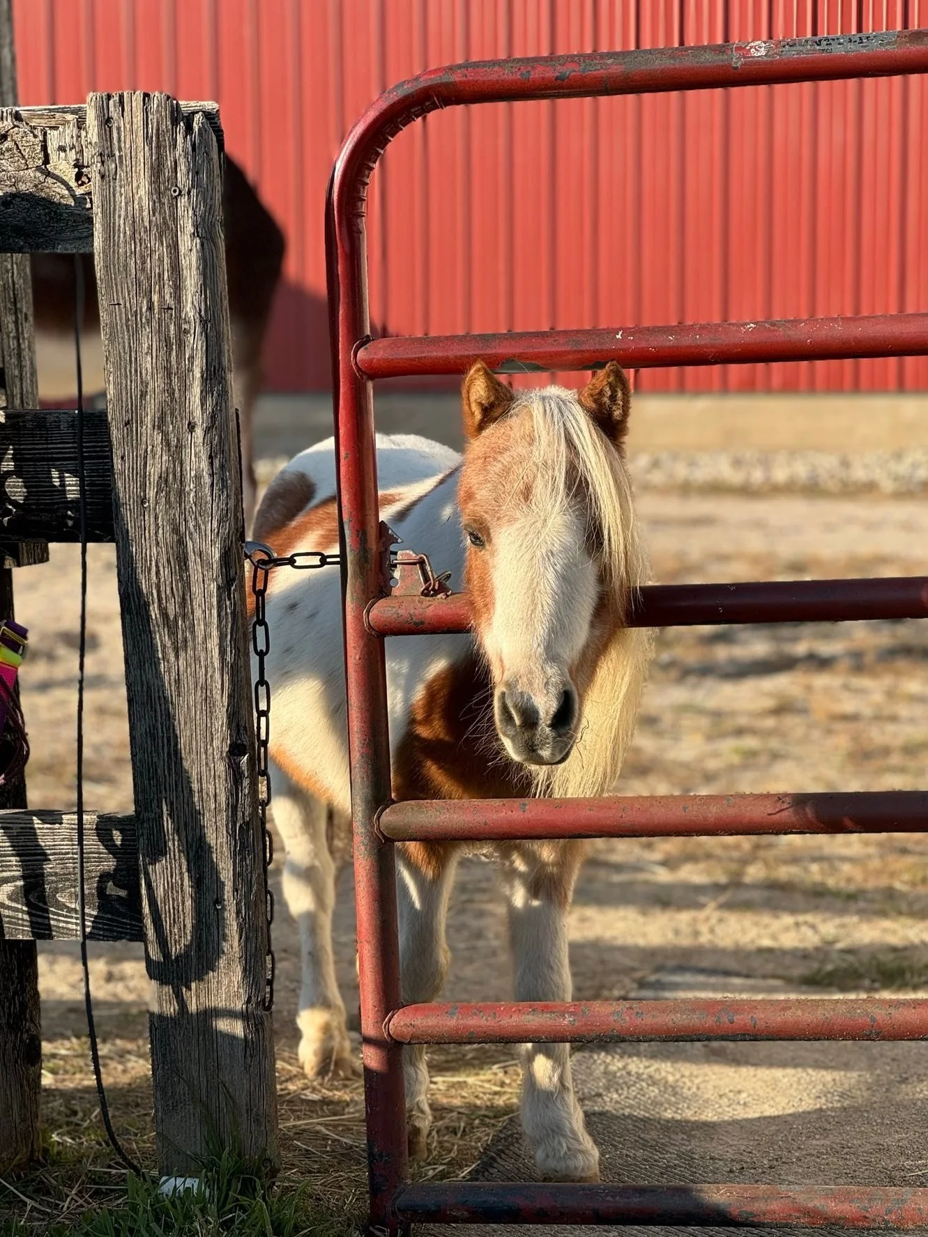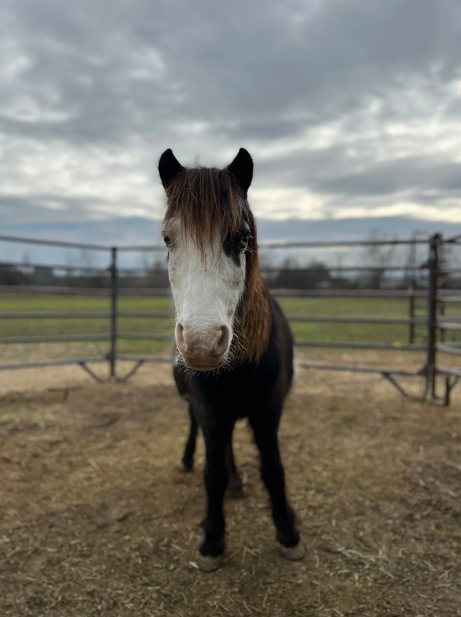 Monte was rescued from auction in July 2025 as part of the “Forever Four”. Monte is an older mini horse, likely in his upper teens. The exhaustion in his eyes when we first saw him devastated our team. It was as though the light was fading. When we unloaded him at quarantine, we started to see that spark return as he explored his safe new space.