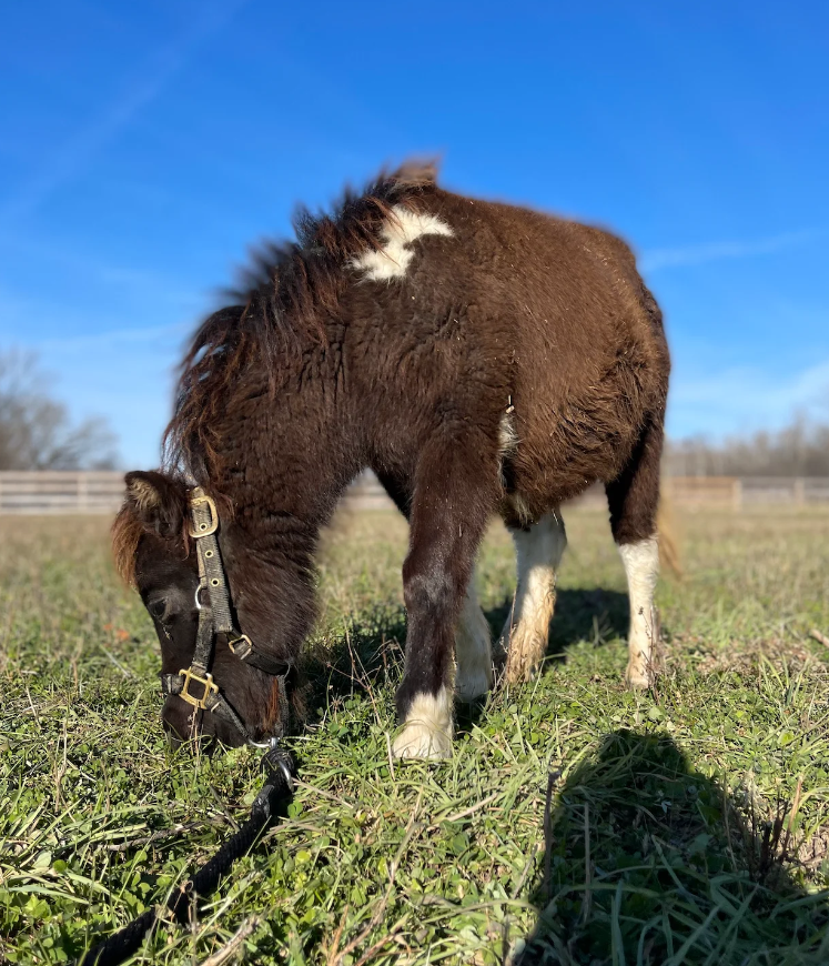 Cat Woman, a 5 month-old mini foal in November of 2021 was rescued alongside her mother, Opal. Upon intake, Cat Woman was sick and struggled to breathe; but with the care of our team, she has blossomed into an energetic foal who loves to run, buck, and rear. She is quite sassy, and over the years has healed her weak stifles (knees.) We hope Cat Woman will participate in human healing at senior living facilities in the future!